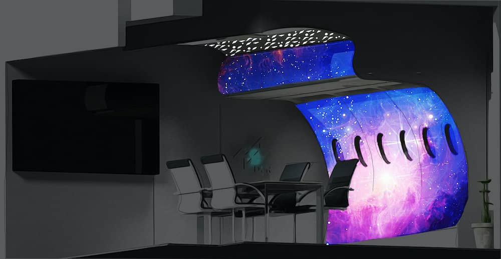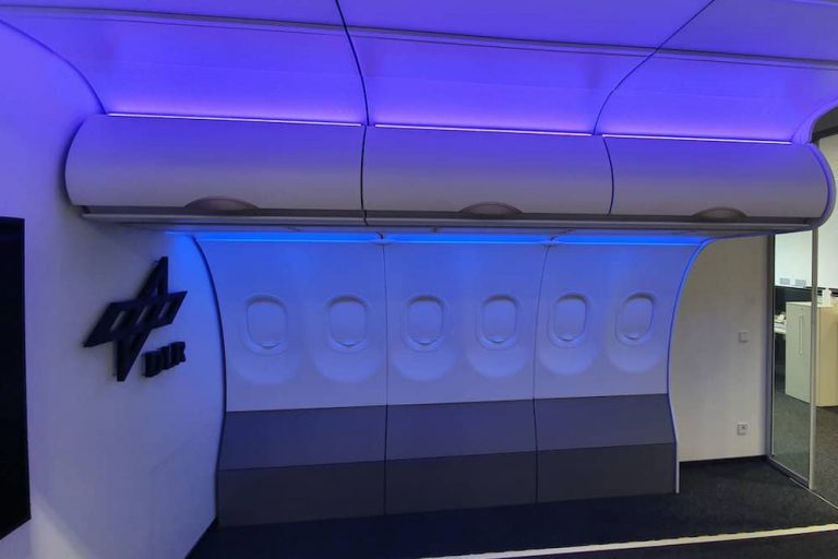 One central feature of this project is the innovate lighting and projection mapping system. It enables the representative illumination of the cabin segment to display original aircraft lighting scenarios, which can be predefined and fully adjusted in color and brightness. Furthermore, it includes a special light panel integrated into the ceiling area, which can illuminate customized patterns.