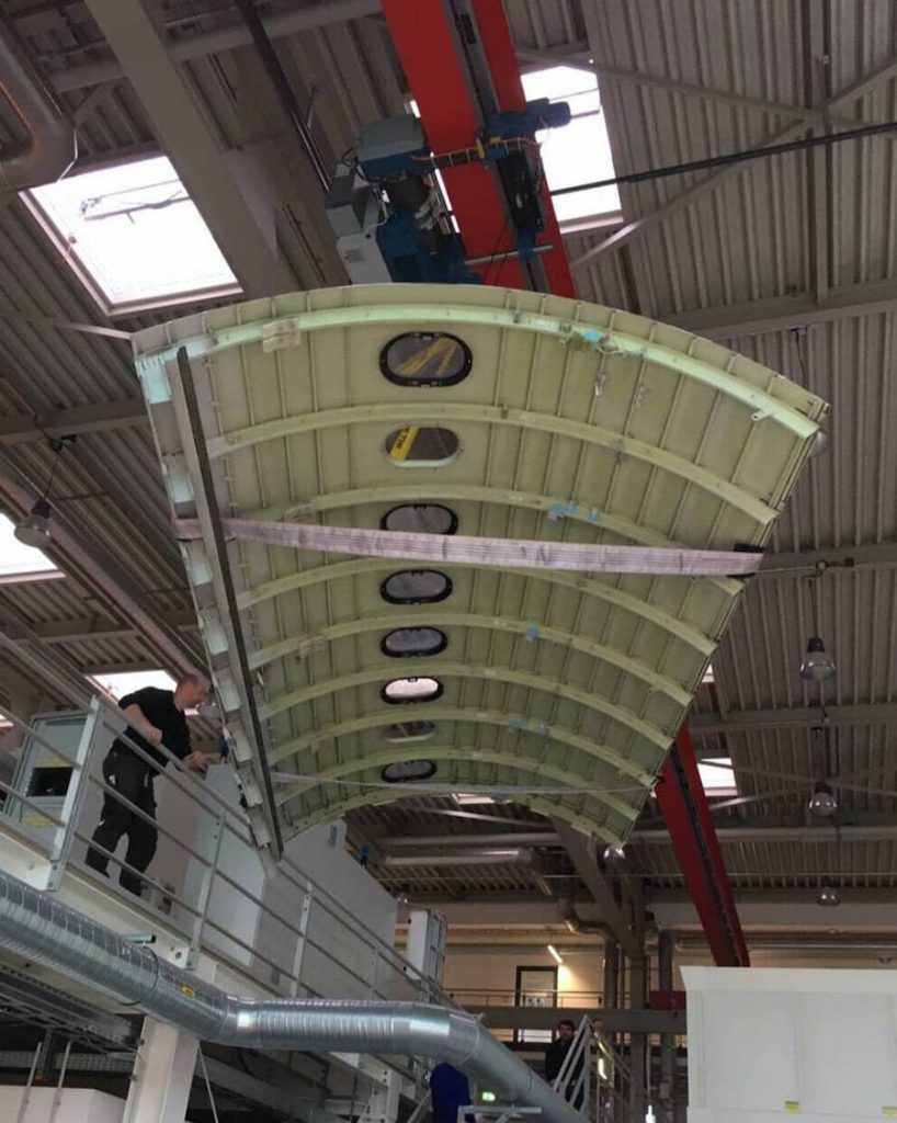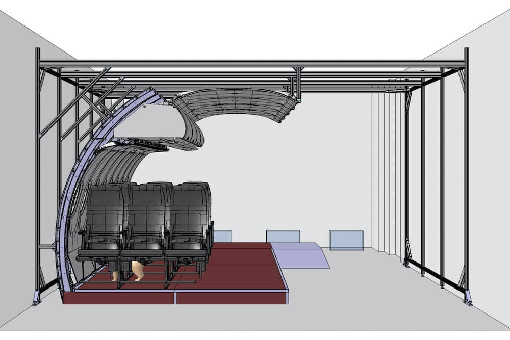 The mock up replicates a section of a one-sided aircraft cabin and shall be used for acceptance testing and design studies. The customer required a special location for the installation, which allows the room to be multifunctional while still being available as meeting room.